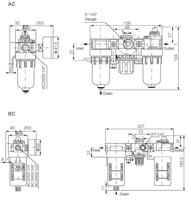.AC2000 BC2000 BC3000 BC4000 series pressure regulator FRL units three combination air pressure regulator air filter oil lubricator supports accurate adjustment of oil mist,rotate the knob to easily adjust the amount of oil mist
